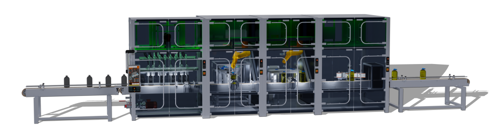 A fully automated liquid media filling line with automated capping, handle placement, labeling, optical quality control, and pallet wrapping—covering the entire process, from bottle handling to final packaging.