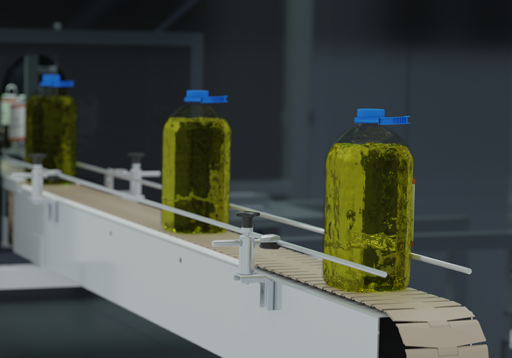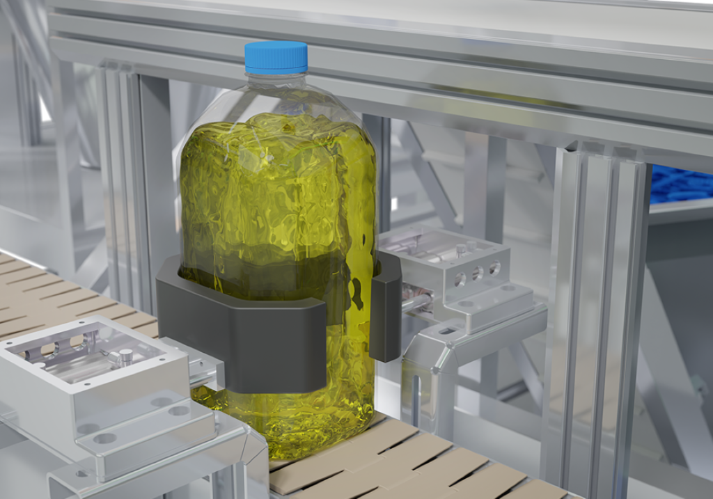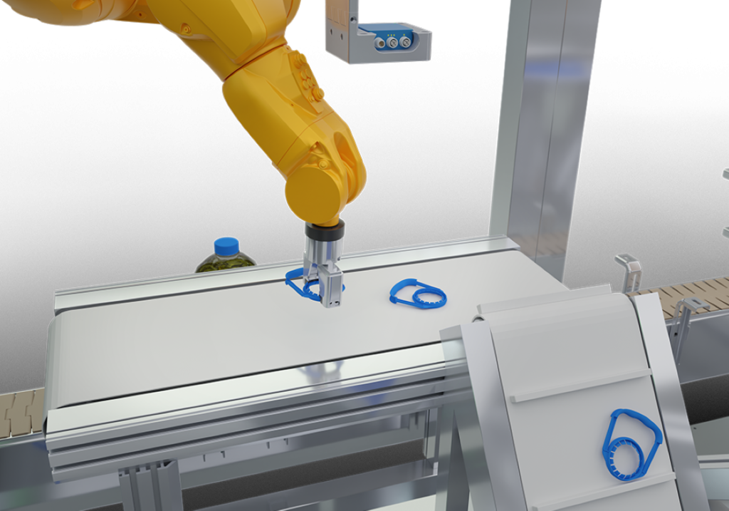 XFR HANDLEGRIP – Robotic handle application on moving bottles with optical orientation verification.